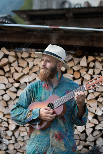 man, mid, adult, caucasian, racked, hold, look, play, ukulele, musical instrument, string instrument, music, lifestyle, individuality, stylish, fashion, hobby, leisure, hipster, alone, 1, casual attire, hat, beard, front, waist up, earring, outdoors, day, people