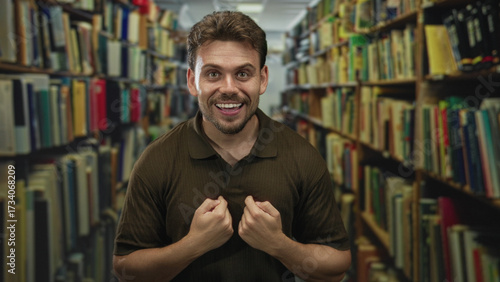 Man points finger to chest amid books on crowded library shelves inside a building aisle; excitement discovery.
