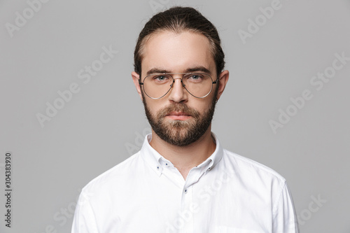 attractive, background, basic, boy, brunette, calm, casual attire, caucasian, confident, hipster, modern, unshaved, focused, grey, guy, photogenic, indoor, isolated, male, man, studio, shirt, unshaved, wall, young, serious, concentrated, grey, businessman, businessperson, business, work, formal, goggles, eyewear