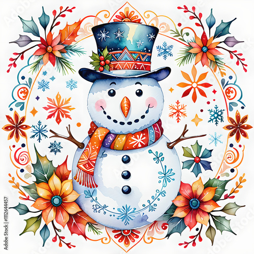 Mandala Snowman: Intricate Watercolor Designs on White Background