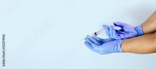 Manos de doctor con guantes quirúrgicos, medicinas y jeringas en diferentes acciones en fondo celeste, concepto de medicina, vida y salud. Vacuna contra distintas enfermedades (covid-19, viruela del