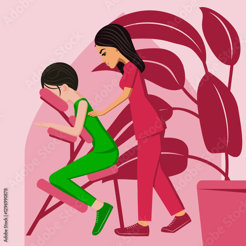 massage, massaging, manual, massage therapist, physical therapist, healer, ethnicity, asian ethnicity, spa, salon, cabinet, body part, body, skin, skincare, bodycare, reiki, alternative medicine, therapy, treatment, health spa, care, health care, physical therapy, beauty, relaxation, person, woman, female, illustration, object, isolated, vector, background, cartoon, flat, style, design, art, poster