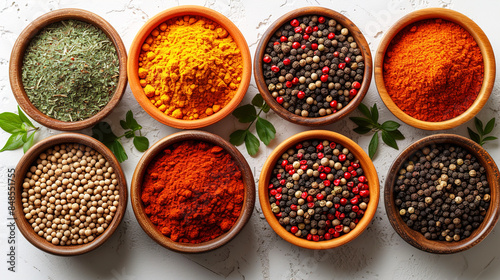 Many bowls filled with different types of spices with white background top view