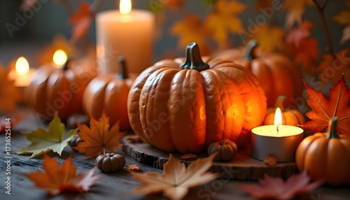Many small pumpkins and candles arranged on a wooden table, creating a festive autumn decoration for holiday celebrations, cozy and seasonal