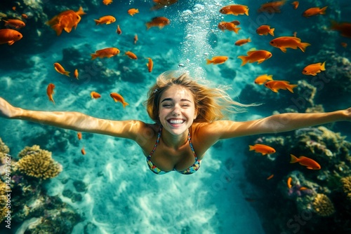 Many tropical fish swim next to her. A gorgeous and sexy happy caucasian young woman with blond hair with a happy face snorkeling among the corals. Bright commercial style image.