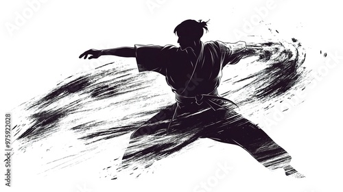 Martial Arts Silhouette with Dynamic Brush Stroke - Karate Stance Illustration on white background