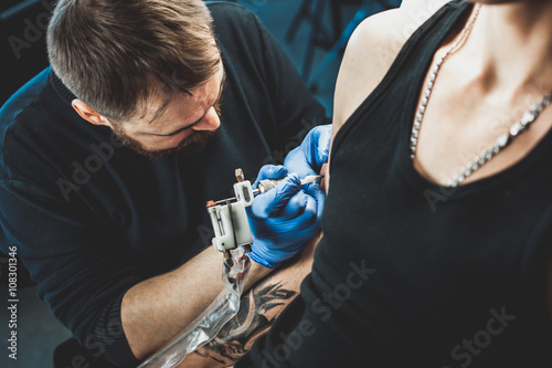 master tattoo artist with a beard makes gloves tattoo on hand men