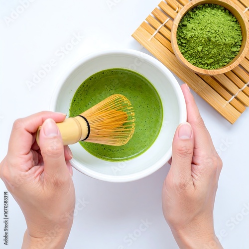 matcha, tea, preparation, hand, bowl, whipped, powder, green, white, bamboo, drink, healthy, asian, natural, food, organic, smooth, beverage, powdered, hot, mixing, stirring, wooden, top, view, isolated, bright, fresh