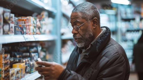 Mature man using mobile phone while standing at supermarket counter in supermarket