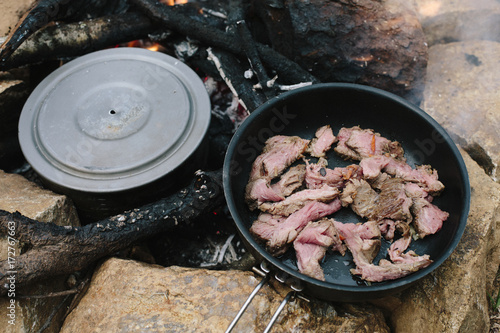 steak, campfire, wood, wilderness, wild, simple, rough, pot, pan, outdoors, nobody, nature, meat, meal, lifestyle, hot, heat, food, fire, explorer, dinner, cooking, camping, camp, adventure