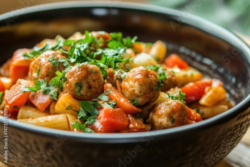Meatball Pasta. Spaghetti with Meatballs, Tomato Sauce, and Fresh Parsley