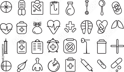 medicals, health care, science, icon, symbol, health, medicine, clinic, hospital, doctor, nurse, patient, treatment, diagnosis, research, laboratory, equipment, instrument, pill, capsule, syringe, stethoscope, heart rate, clipboard, alarmclock, cross, vintage, retro, illustration, graphic design, vector, line art, black-and-white, clean, simple, modern, professional, educational, informational, collection