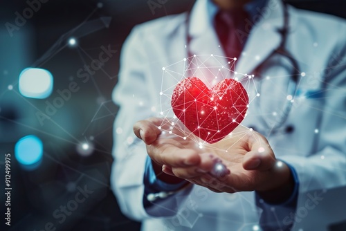 Medicine doctor holding red heart shape in hand with medical icon network connection modern virtual screen interface, service mind and medical technology network concept generative ai