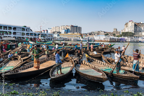 Men in their canoes waiting for new clients, Port of Dhaka
