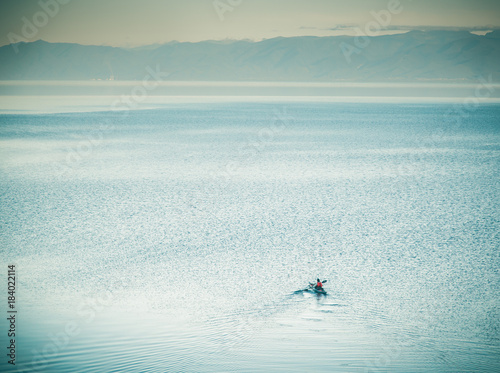 Mеn kayaking on Lake Baikal. Landscape. Siberia.