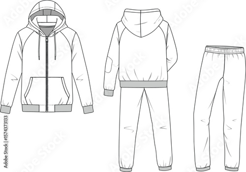 Men's and Women's Unisex Athletic Sportswear Fashion Design Flat Sketch Drawing, Hooded Sweatshirt Jacket and Jogger Sweatpants Set, Apparel Template Vector Illustration.