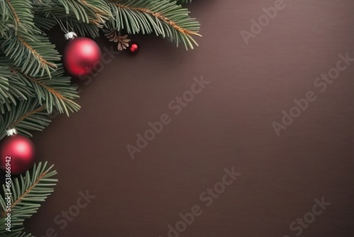 Merry Christmas and Happy New Year greeting card design with spruce branches and decorations with copy space. Seasonal holidays banner. Generative AI