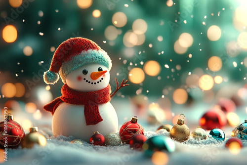 Merry Christmas with Snowman green blurry background decorated with Christmas element, snow falling in the air, bokeh lights with copy space
