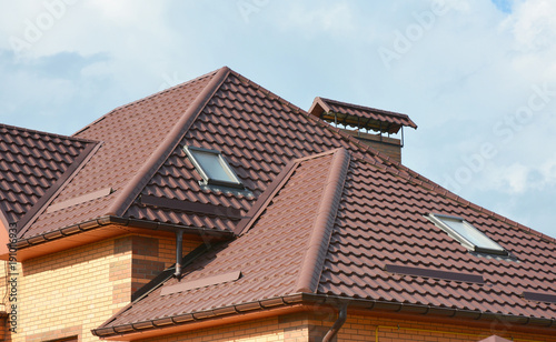 Metal roof with modern house attic construction with roof gutter