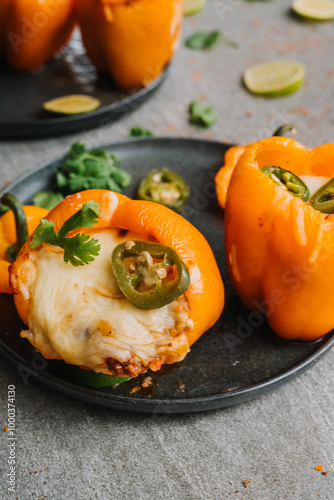stuffed peppers, pepper, orange, autumn, holiday, october, vegetable, skittish, fall, food, healthy eating, meal, bell pepper, freshness, dinner, plate, cooking, food and drink, no people, stuffed, baked, orange color, celebration, decoration, pumpkin, taco, mexican food, spice, cilantro, lime, garnish, lunch, horror, jalapeno