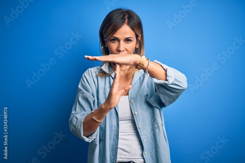 Middle age beautiful woman wearing casual shirt standing over isolated blue background Doing time out gesture with hands, frustrated and serious face