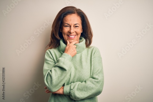 Middle age beautiful woman wearing casual turtleneck sweater over isolated white background looking confident at the camera smiling with crossed arms and hand raised on chin. Thinking positive.