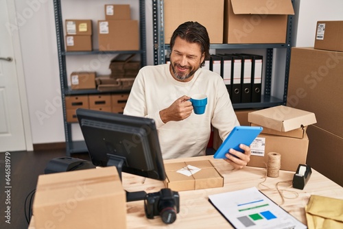 Middle age man ecommerce business worker using touchpad drinking coffee at office