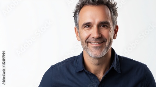 Middle-Aged Man in Dark Blue Shirt Smiling on White Background