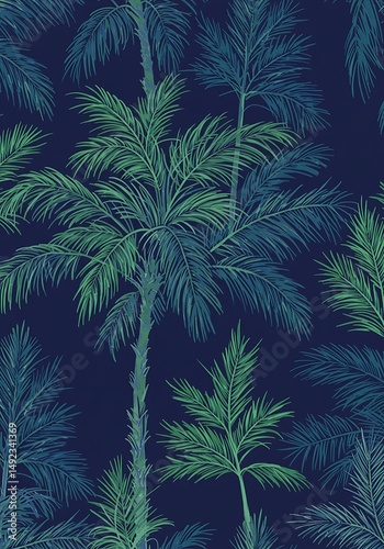 palm tree, tropical, leaf, green, blue, dark, background, pattern, repeat, seamless, nature, foliage, illustration, design, vibrant, exotic, summer, plant, artwork, texture, image, graphic, wallpaper, digital, vegetation, midnight