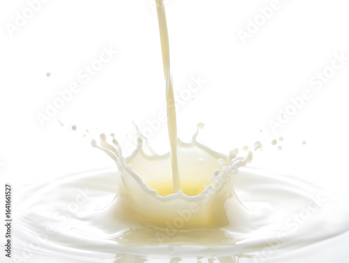 Milk pouring and creating a splash a clean and simple image highlighting the creamy texture and freshness of dairy on white background