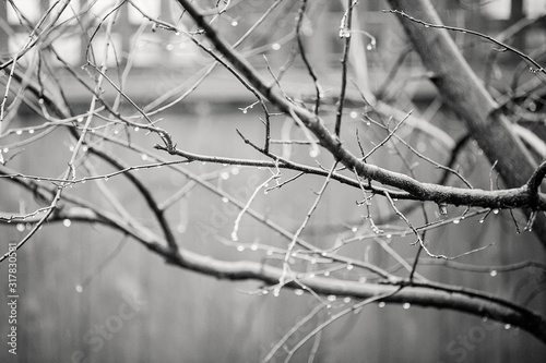 Mini raindrops in spring on trees black and white