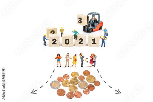 miniature worker team building standing front of forklift machine with white 2021 number on wooden block on white background.