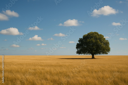 Minimal field landscape with golden grass and lone tree under blue sky, wide horizontal nature photo with open composition