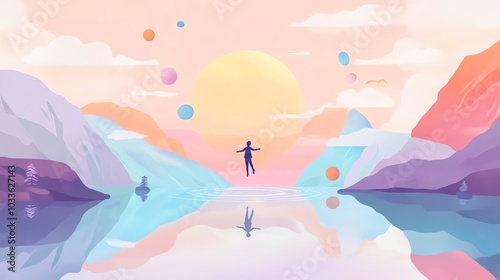 person, levitation, lake, mirror, surreal, earth, float, object, pastel, colours, exploration, alchemy, poetic, symbolize, beauty, artistry, expression, dreamlike, essence, element, peaceful, landscape, calmness, aethereal, whimsical, vision, phenomena, minimalistic, lucid, journey, escape, symmetry, elevation, environment, creativity, concept, abstract, visual, dreamer, imagination, transcendence, dreamscape, philosophy, stillness, meditative, minimalism