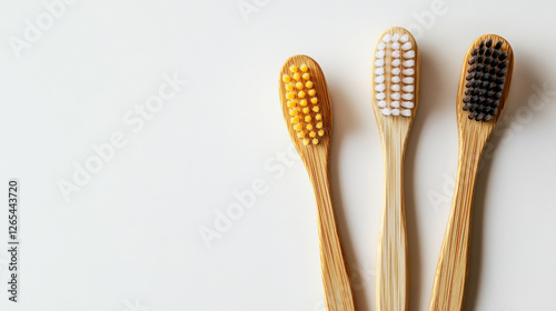 Minimalist bamboo toothbrush set in yellow, white, and black colors on white background. Eco friendly and stylish, perfect for sustainable living
