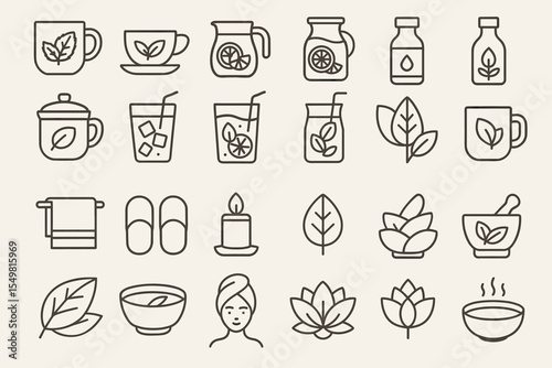 Minimalist icons of tea, leaves, and wellness items in line art style