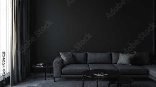 living room, modern, interior, dark, grey, coffee table, black, wall, window, curtain, natural light, minimalist, design, style, furniture, home, decor, room, space, house, apartment, contemporary, simple, clean, elegant, sophisticated, stylish, comfortable, cosy, relaxing, tranquil, calm, peaceful, luxurious, warm, inviting, bright