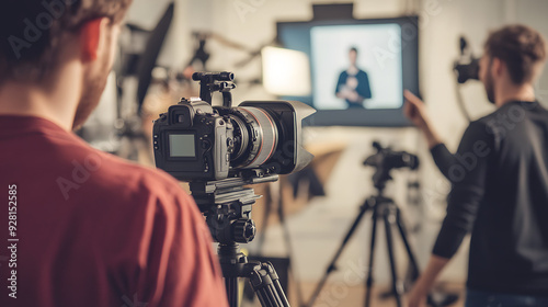 Minimalist modern video production studio featuring sleek equipment, isolated camera focus, and video edit monitor display, embodying cutting-edge media creation aesthetics.