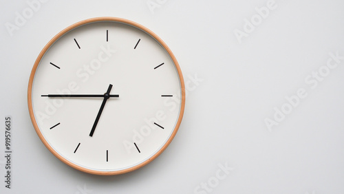 Minimalist wooden Wall Clock on White Wooden Surface with Space for Text – Time Set at 18.45/06.45