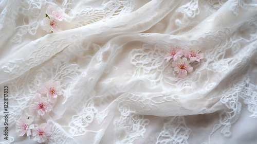 Minimalistic flat lay of white lace fabric and soft pink flowers
