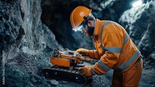 Mining engineer in a cave working with an autonomous robotic drill, wearing orange safety gear and helmet with headlamp.