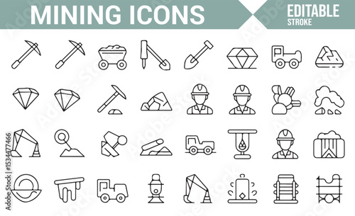 Mining industry icons including excavators, diamonds, mining carts, and workers for industrial and geological designs.