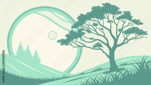 mint, green, landscape, illustration, tree, hill, abstract, circle, nature, scenery, vector, design, art, background, environment, calm, peaceful, minimalist, graphic, drawing, artwork, scene, natural, element, simple, modern, artistic, creative, fresh, clean, tranquil, rural, countryside, pastoral, serene, organic, eco, ecological, botanical, foliage, plant