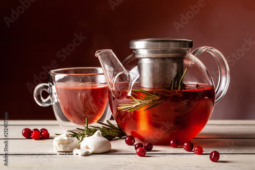 Mint tea with forest berries in a cup of double glass and a glass teapot on a wooden table, on a red background.