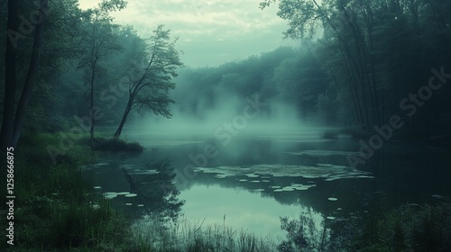 Misty Forest Lake Scene