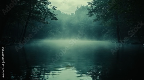 lake, forest, mist, fog, dawn, water, serene, calm, nature, tree, dark, moody, mysterious, tranquil, peaceful, quiet, still, landscape, background, scenic, travel, adventure, exploration, wilderness, summer, morning, atmosphere, dreamy, magical, mystical, skittish, gothic, ominous, shadow, light, green, blue, grey, photo, image, picture, photo