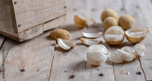 Mix of peeled and clusters whole of exotic Thai fruit called Longkong or lansium parasiticumor southern langsat on wooden table and background. It is a famous sweet tropical fruit in southeast asia.