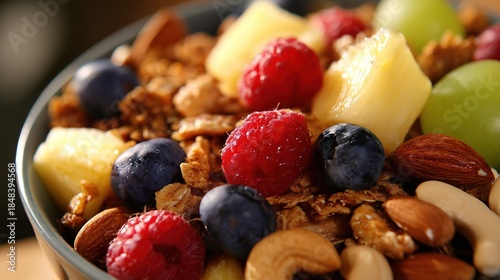 Mixed fruit and nut cereal bowl with raspberries blueberries pineapple almonds cashews, healthy nutritious breakfast material