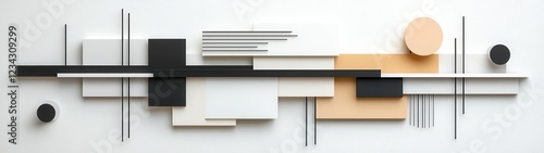 Modern abstract wall art featuring geometric shapes and lines in a harmonious color palette of black, white, and beige.