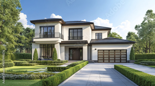 house, exterior, modern, garage, landscaping, architecture, residential, driveway, tree, sunlight, contemporary, design, facades, greenery, window, entrance, luxury, property, home, structure, front yard, peaceful, elegant, roomy, two-story, roof, symmetry, lawn